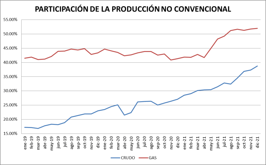La participación de los no convencionales en el total de la producción de petróleo: