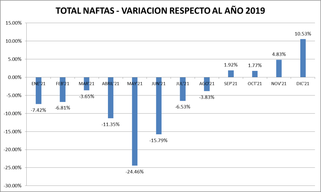 Aquí vemos que las ventas son, en julio de 2021, un 6,53% menor que en el año 2019, continuando los negativos de los meses anteriores. En agosto el negativo se achica y, finalmente, en septiembre de 2021 se supera el nivel de dos años atrás. En noviembre, y por tercer mes consecutivo, se registra en 2021 una venta de naftas superior al 2019 de 4,83% y ya en diciembre el crecimiento se consolida en 10,53%.