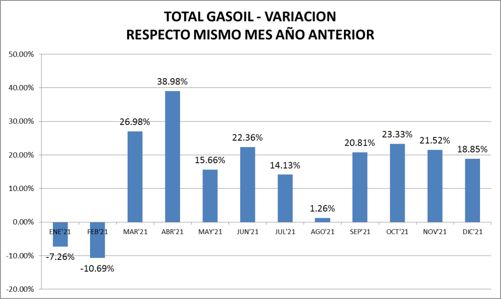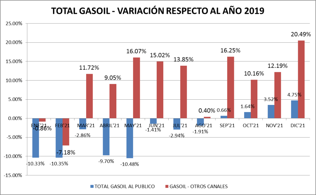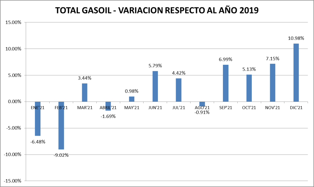 El gasoil vende en diciembre de 2021 un 10,98% más que en el 2019, lo que es alentador para el sector, influenciado fuertemente por el agro y el transporte.