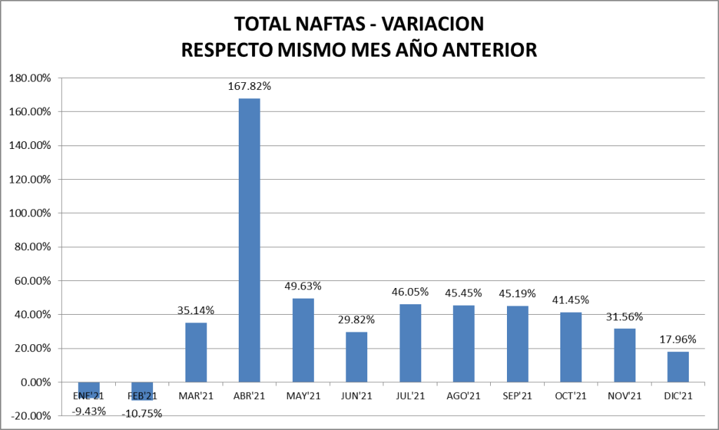 Con respecto a diciembre de 2020 las ventas de naftas y gasoil (total país y todos los tipos) aumentaron un 17,96% y 18,85%, respectivamente.