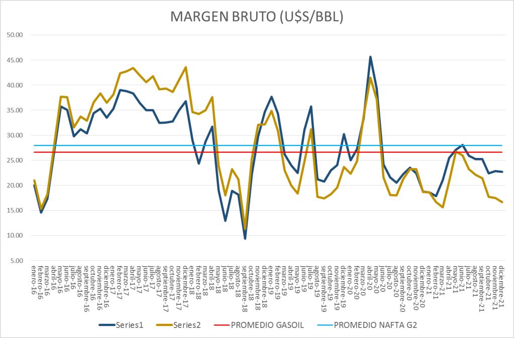 En diciembre de 2021 se reduce el Margen Bruto de Refinación de la nafta grado 2 en un 4,59%, mientras que el del gasoil se mantiene relativamente estable (-0,44%).