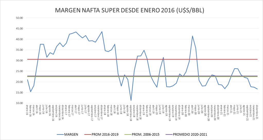 Con estos valores, el margen de la nafta súper se ubica un 10,59% por debajo del de un año atrás, mientras que el del gasoil está un 21,1% por encima de diciembre de 2020.