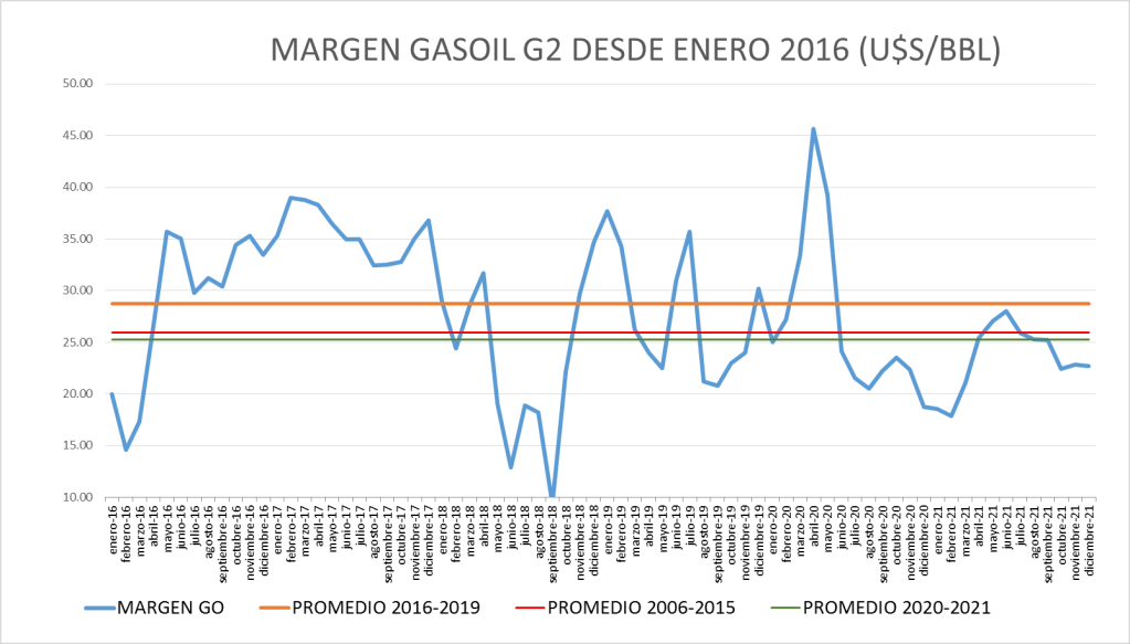 Situación parecida a la nafta súper. El margen bruto de refinación del gasoil continúa por debajo de todos los promedios tomados como referencia.