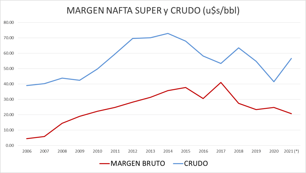 El margen bruto de nafta cae por debajo de todos los promedios tomados como referencia.