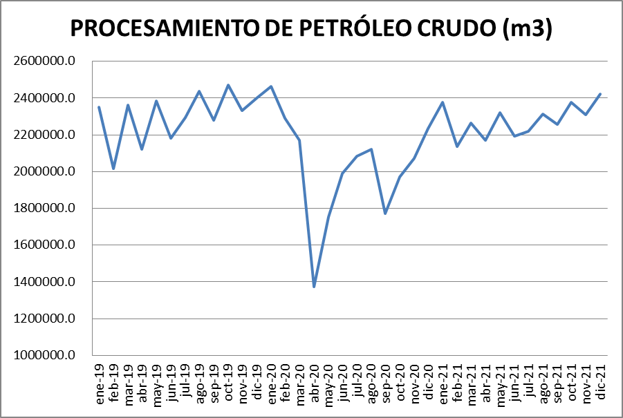 El procesamiento de petróleo crudo aumentó, en diciembre de 2021, un 8,48% respecto al mismo mes del año 2020, y fue un 4,83% mayor que el de noviembre de 2021. Recordemos que el procesamiento de crudo del año 2020 se vio restringido por la falta de demanda, aunque ya en diciembre había una recuperación.