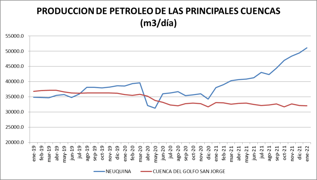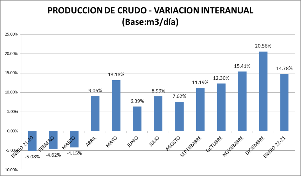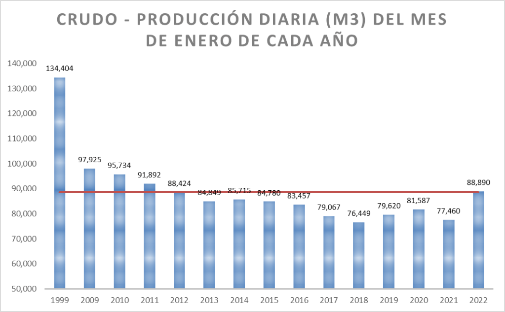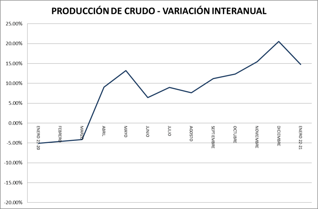 La producción de petróleo crudo del país en enero de 202 subió un 1,88% respecto a diciembre de 2021. Con respecto a enero de 2021 la producción es un 14,78% superior. La comparación con diciembre de 2019 muestra al 2022 un 11,64% por encima.