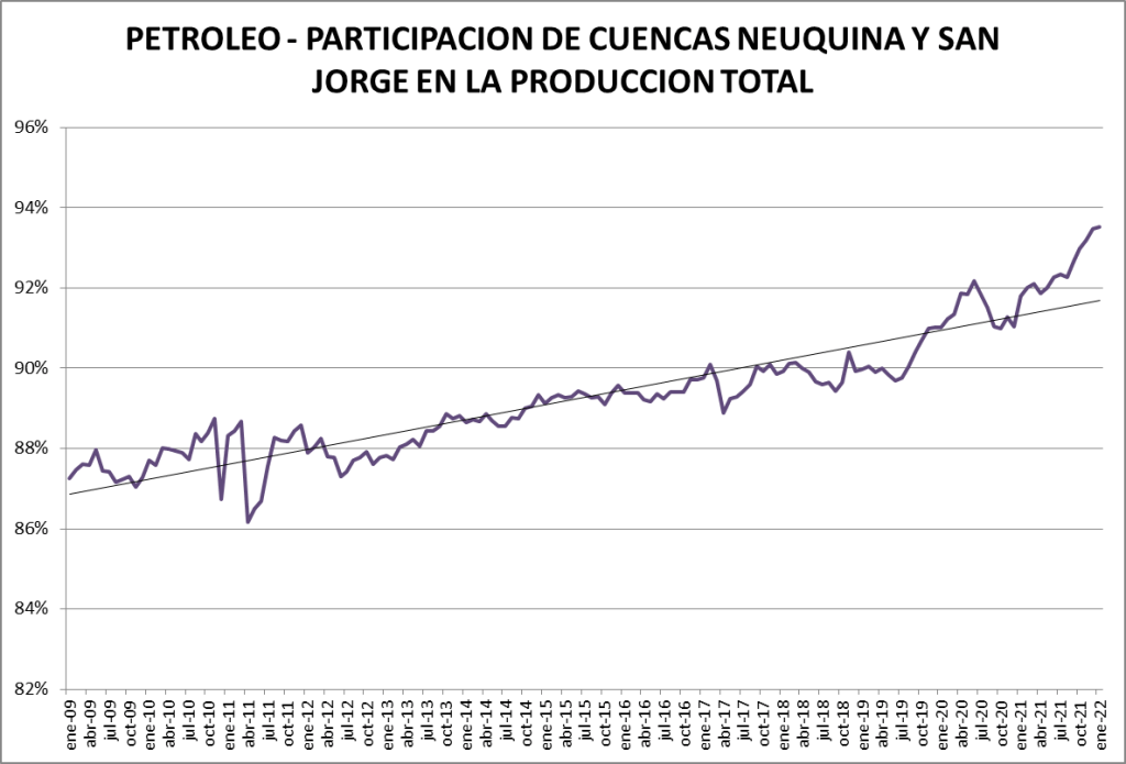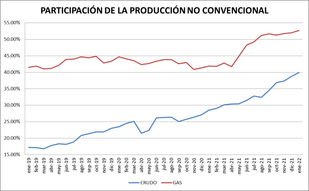 El crudo, que sigue en franco ascenso, llegó al 39,96% en enero. Recordemos que en enero de 2021 era 28,53% de participación en la producción total.