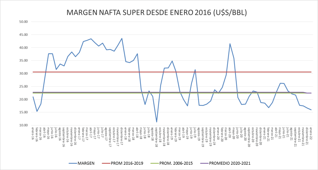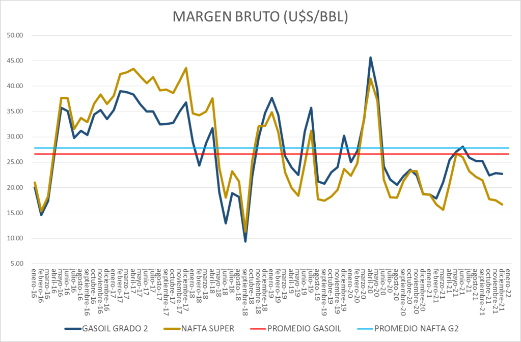 Nota importante: Al momento de confección de este informe la empresa Pan American Energy (AXION) no había informado los precios en planta de despacho sin impuestos de enero de 2022. Este hecho puede significar algún cambio en el resultado del cálculo del Margen Bruto de Refinación para el que se utiliza el precio promedio ponderado de todas las compañías del mercado.