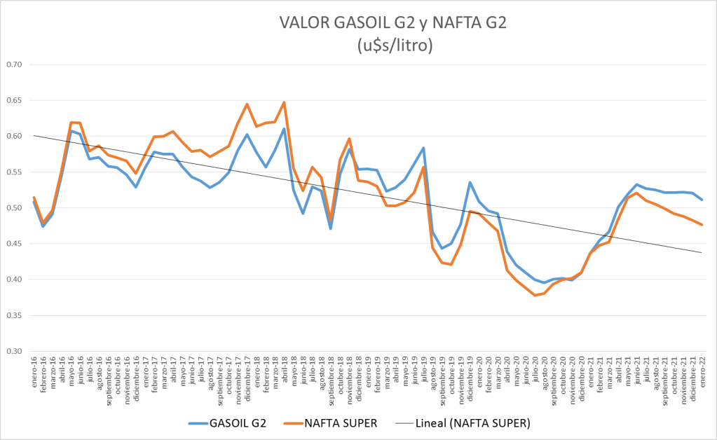 | En u$s/litro | NAFTA GRADO 2 | GASOIL GRADO 2 |