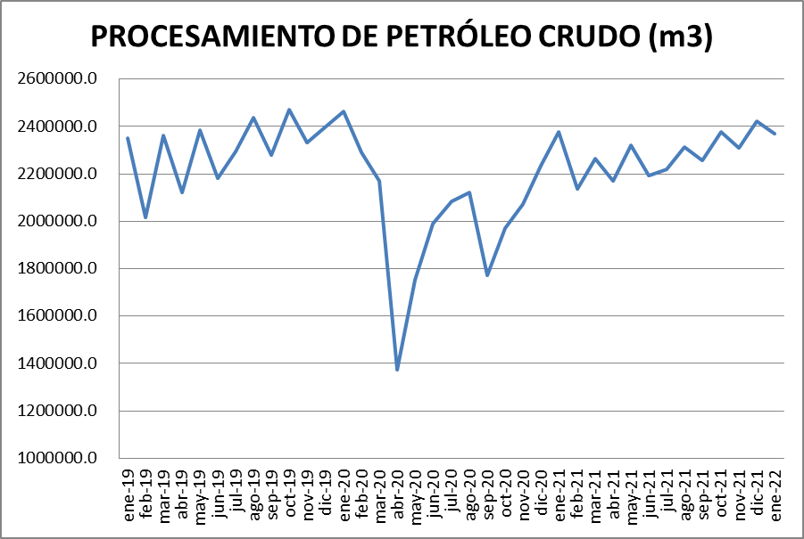 El procesamiento de petróleo crudo cayó, en enero de 2022, un 0,27% respecto al mismo mes del año 2021, y fue, también, un 2,12% menor que el de diciembre de 2021.