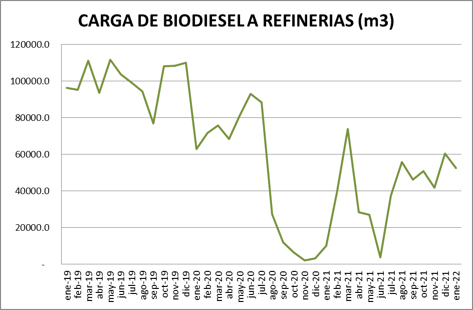 En cuanto al bioetanol, se utilizó en enero de 2022, un 17,57% menos que en diciembre 2021.