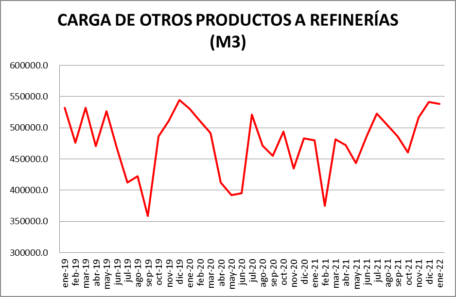 Dentro del rubro “Otras cargas” donde ” se encuentran: naftas sin terminar, mejoradores octánicos, cortes de gasoil, nafta virgen, cortes de kerosene, nafta reformada, destilado de vacío, etc., la evolución fue la siguiente: respecto a diciembre de 2021: -0,57%; respecto a enero de 2021: +12,19%.
