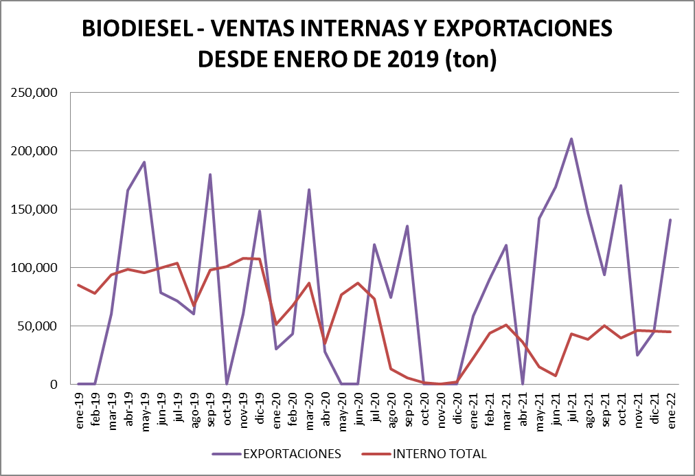 Para el biodiesel, la información parte desde enero de 2008 para las exportaciones y desde febrero de 2010 para la venta a refinerías.