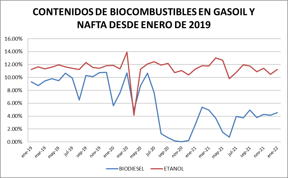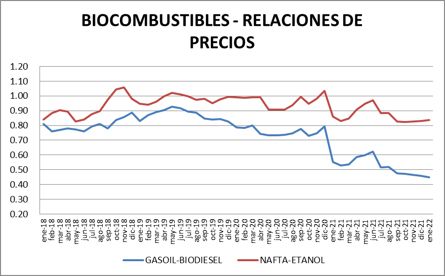 En enero de 2022, el biodiesel volvió a subir (en pesos) un 2,9%, casi siguiendo el ritmo devaluatorio del dólar oficial, mientras que el bioetanol conserva el mismo precio de 59,35 $/litro desde septiembre de 2021.
