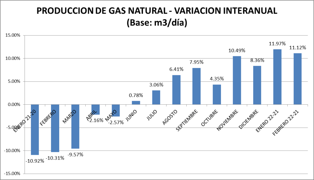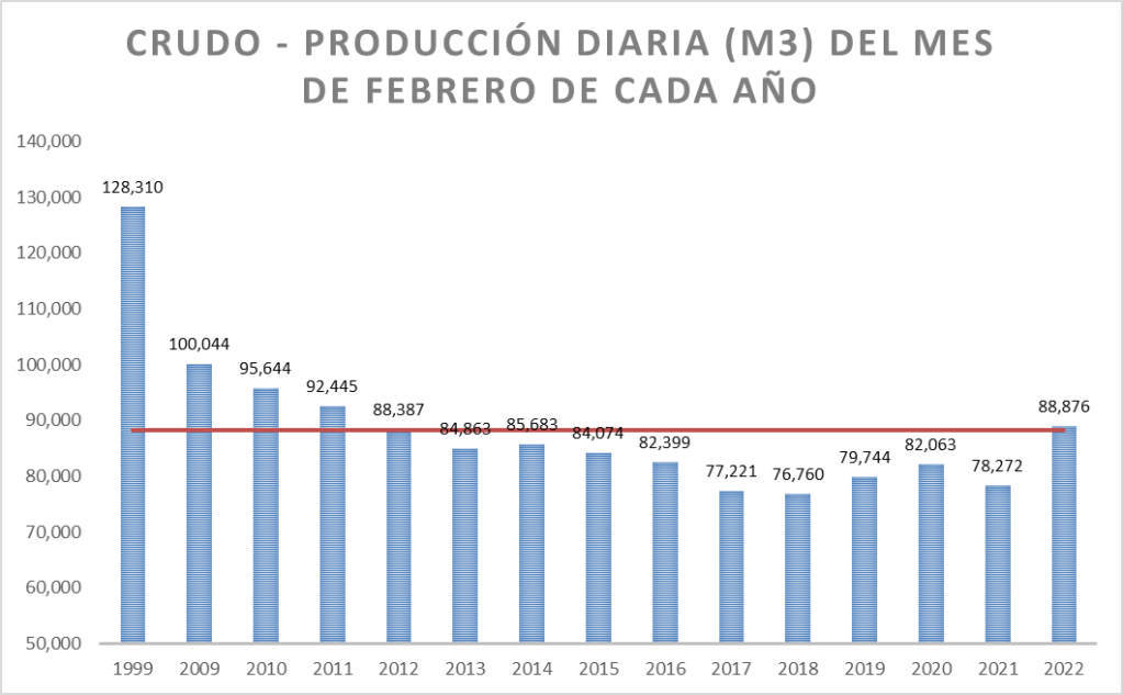La producción diaria de febrero de 2022 es la más alta de los últimos diez años y prácticamente coincide con el promedio de la serie (que incluye el valor de 1999).
