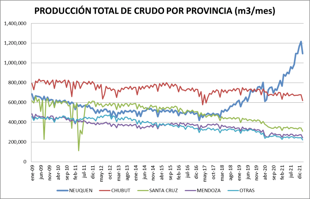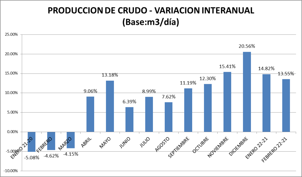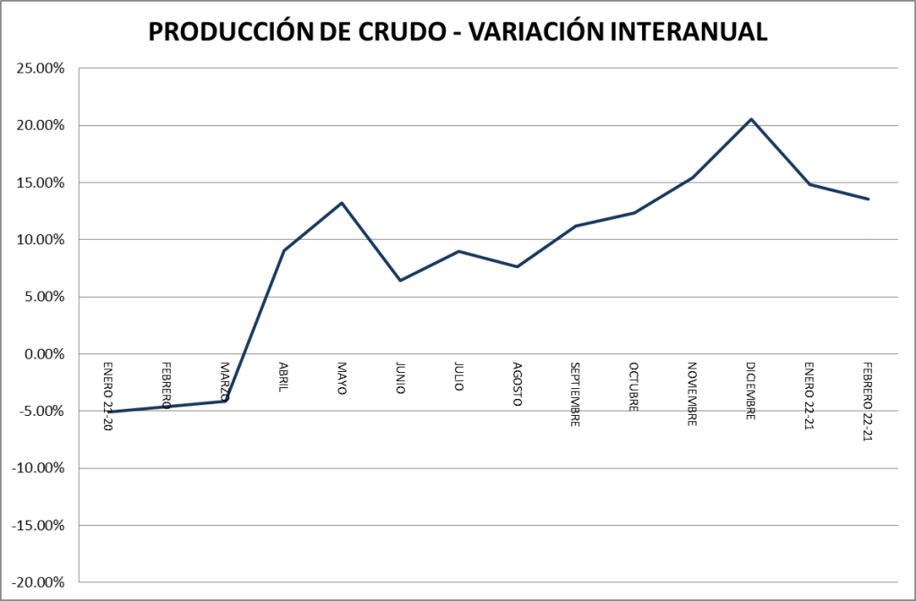 La producción de petróleo crudo del país en febrero de 2022 bajó un 0,06% respecto a enero del mismo año. Con respecto a febrero de 2021 la producción es un 13,55% superior. La comparación con febrero de 2019 muestra al 2022 un 11,5% por encima.