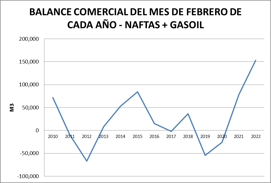 Para el análisis que presentamos a continuación, que tiene como objetivo realizar un Balance Comercial, tomaremos los volúmenes de nafta grado 2, nafta grado 3, gasoil grado 2 y gasoil grado 3, correspondientes al mes de febrero de cada año (último dato disponible).