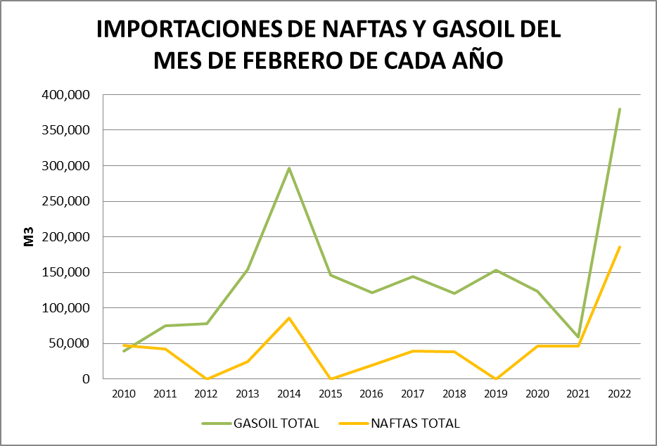 En febrero de 2022 la importación de los cuatro productos representó cerca del 30% del total vendido, debido a una importante entrada de gasoil grado 3.