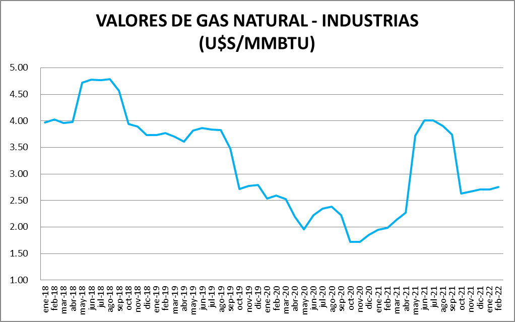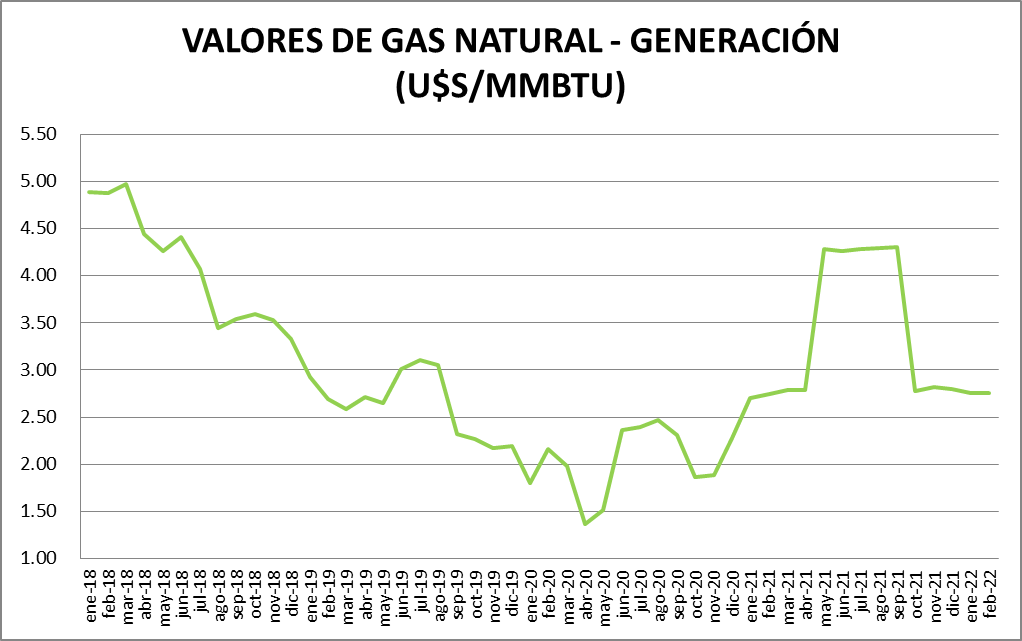 El precio del gas natural dirigido a la generación eléctrica, en febrero 2022, no tuvo variaciones respecto al vigente en enero de 2022. Pero con el aumento de mayo, el valor de febrero de 2022 es, todavía, un 0,73% más grande que el de febrero de 2021.