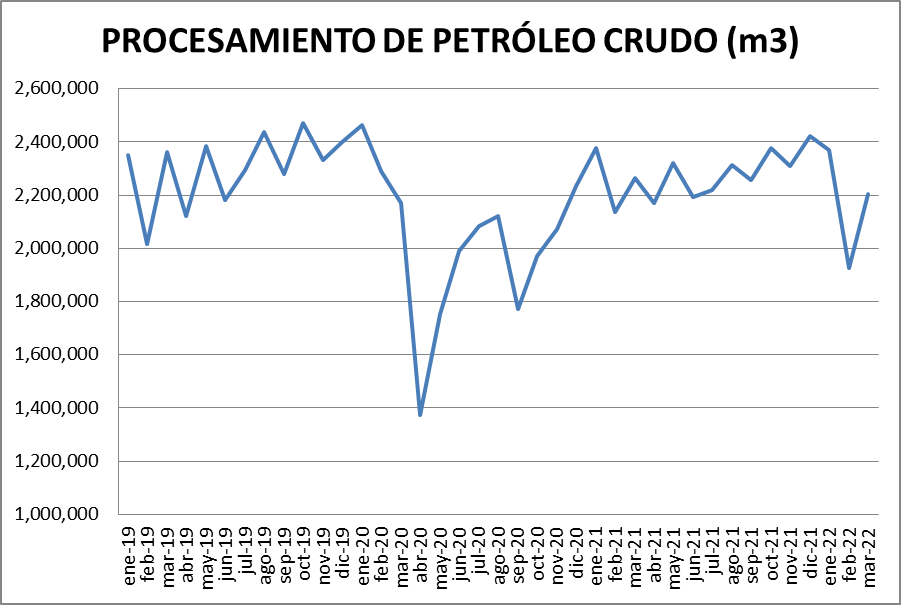 Respecto a marzo de 2021 la caída del procesamiento de petróleo crudo fue de 2,76%.