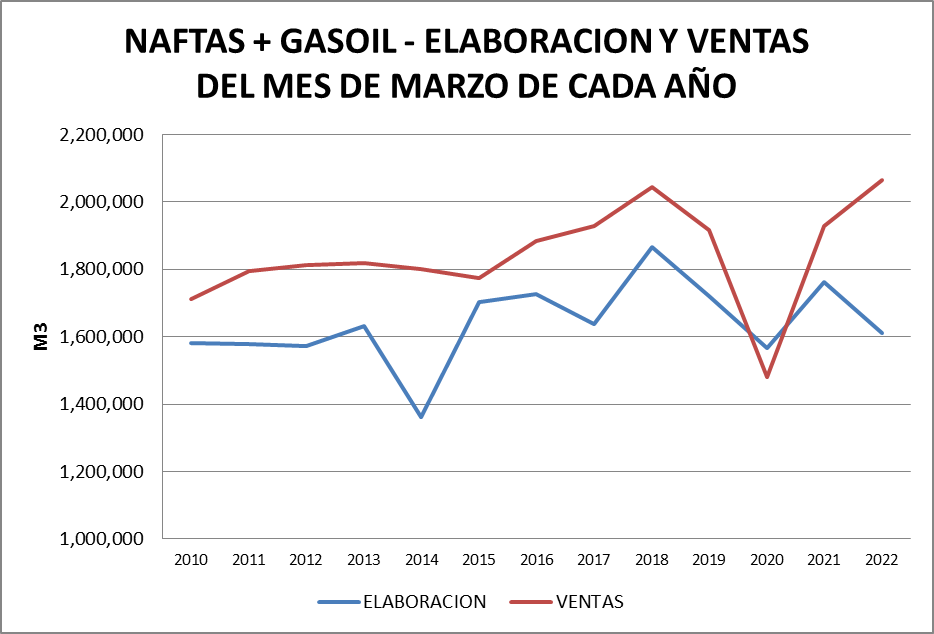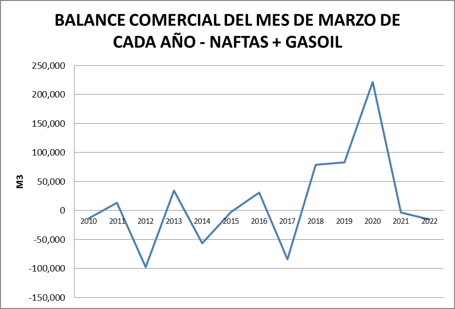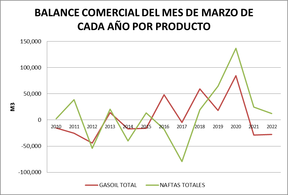 En marzo de 2022, al igual que en febrero del mismo año, aparece un balance negativo de gasoil grado 2 que podrían significar problemas de abastecimiento puntuales.
