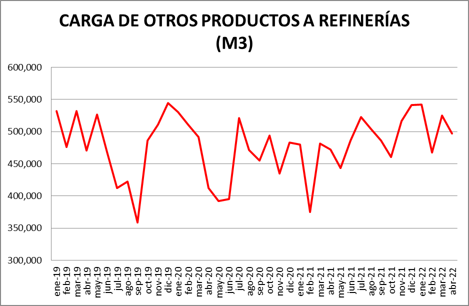Dentro del rubro “Otras cargas” donde ” se encuentran: naftas sin terminar, mejoradores octánicos, cortes de gasoil, nafta virgen, cortes de kerosene, nafta reformada, destilado de vacío, etc., la evolución fue la siguiente: respecto a marzo de 2022: -5,42%; respecto a abril de 2021: +5,17%.