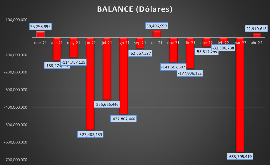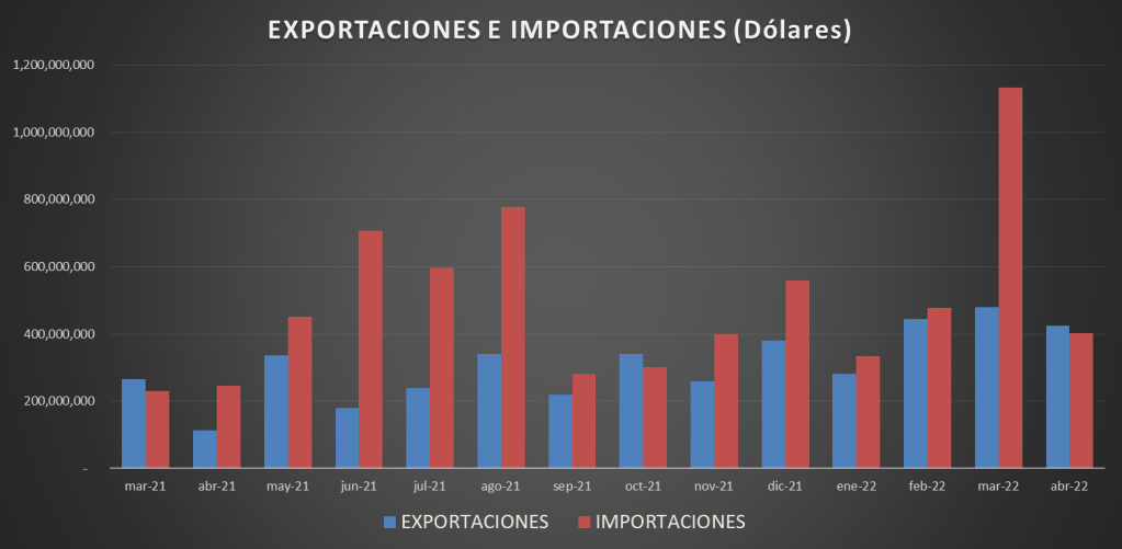 Las importaciones totales en abril de 2022 fueron de 402,1 MMu$s y las exportaciones de 425,5 MMu$s, resultando un balance positivo de 22,9 MMu$s.