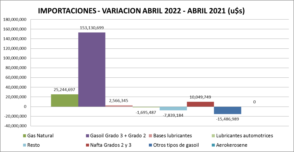 La importación de combustibles terminados, como el gasoil (grado 2 + grado 3), con 219,8 MMu$s y las naftas con 39,1 MMu$s fueron importantes. Entre ambos productos se importó 258,9 millones de dólares más que abril de 2021.