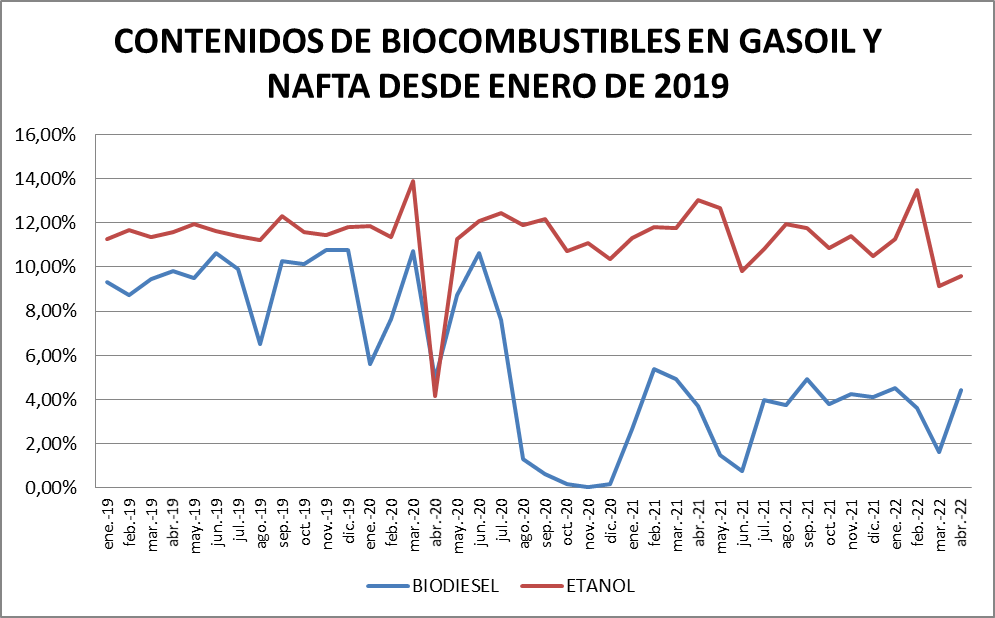 En abril se recupera un poco el contenido de etanol en naftas, llegando al 9,6%, pero lejos del 13% registrado un año atrás, en abril de 2021.