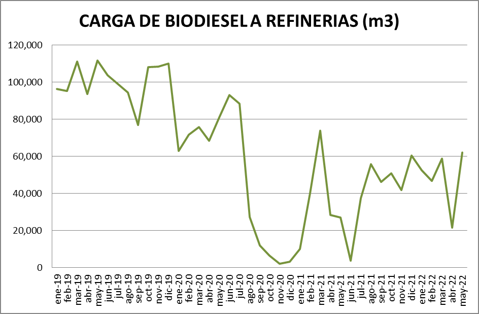 La carga de biodiesel en refinerías aumentó, en mayo, un 188,13% respecto al mes anterior, recuperando lo perdido el mes anterior donde, insólitamente, y ante un desabastecimiento generalizado de gasoil, se había bajado el corte a menos del 2%.
