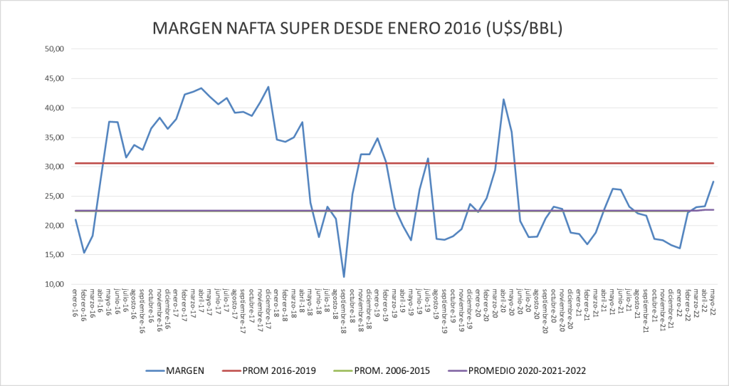 El margen bruto de nafta supera claramente, con el aumento de mayo, el valor del promedio del período enero 2020 – abril 2022.