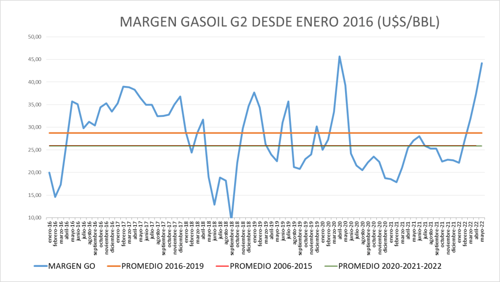 El Margen del gasoil grado 2 de mayo de 2022 (44,13 u$s/bbl) se sitúa por encima del promedio del período enero de 2016 a mayo de 2022 (26,5938 u$s/bbl) y es el segundo valor más alto de la serie.