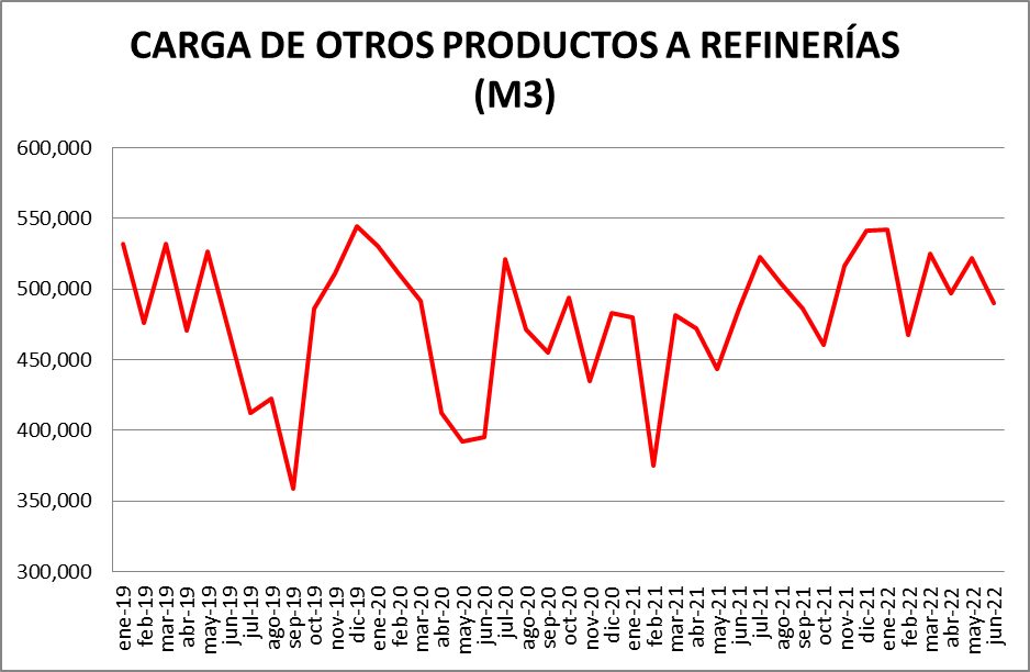 Dentro del rubro “Otras cargas” donde ” se encuentran: naftas sin terminar, mejoradores octánicos, cortes de gasoil, nafta virgen, cortes de kerosene, nafta reformada, destilado de vacío, etc., la evolución fue la siguiente: respecto a mayo de 2022: -5,36%; respecto a junio de 2021: -18,31%.