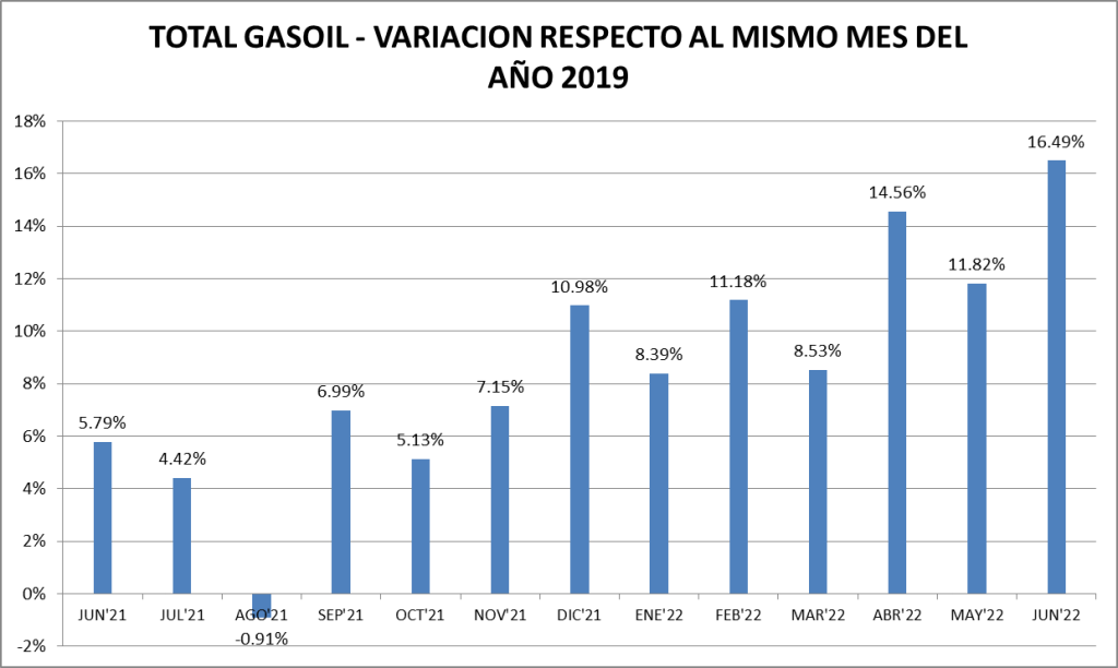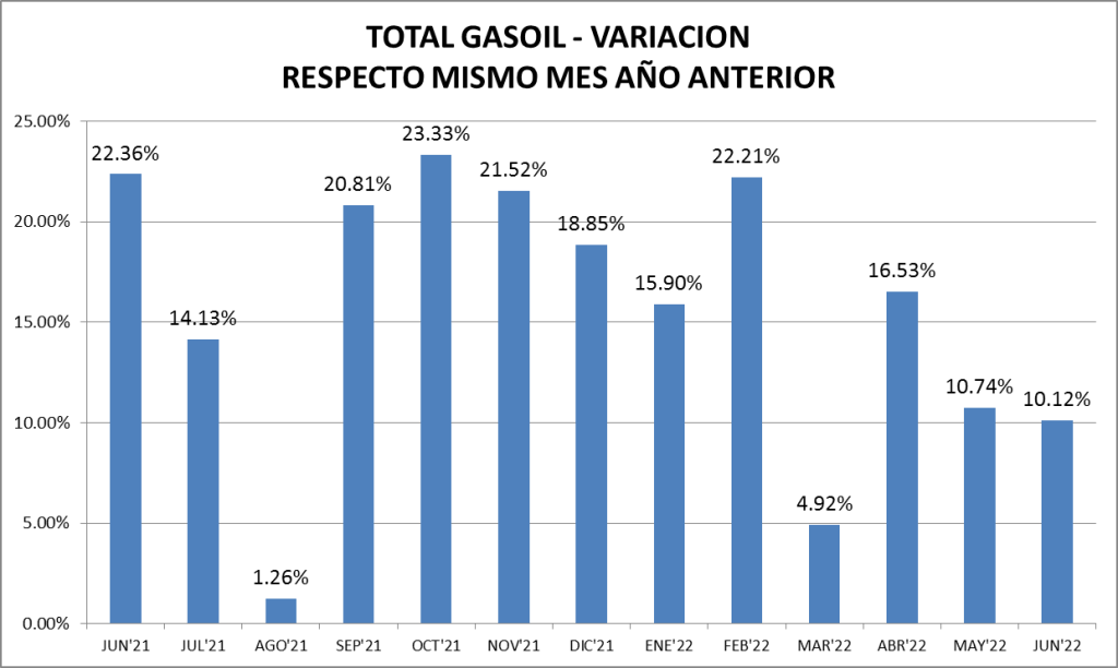 El gasoil vende en junio de 2022 un 10,12% más que en el 2021, lo que es alentador para el sector, influenciado fuertemente por el agro y el transporte. Sin embargo, este crecimiento es el menor de los últimos meses.