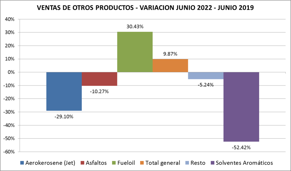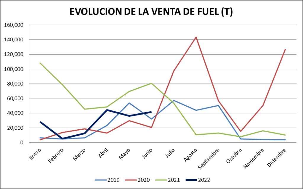Las ventas de fuel oil registradas en junio son 41.709 toneladas, la mitad de lo realizado en el año 2021 (80.603 t).