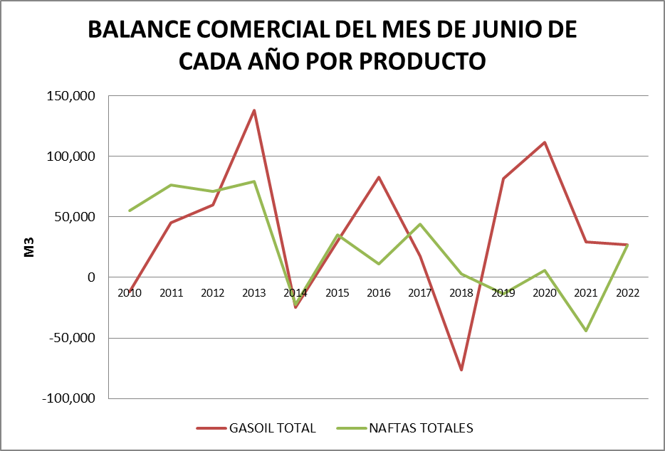 Para el análisis que presentamos a continuación, que tiene como objetivo realizar un Balance Comercial, tomaremos los volúmenes de nafta grado 2, nafta grado 3, gasoil grado 2 y gasoil grado 3, correspondientes al mes de junio de cada año (último dato disponible).