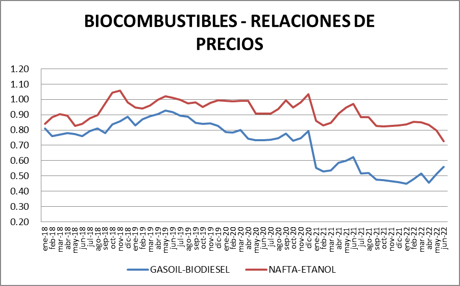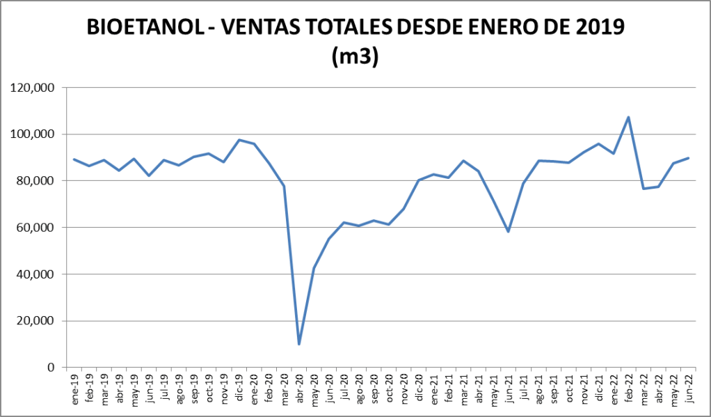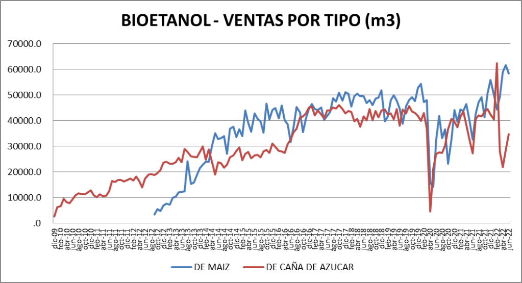 El contenido de bioetanol en naftas fue del 9,58% en abril de 2022, llegando a 11,15% en mayo y 11,30% en junio.