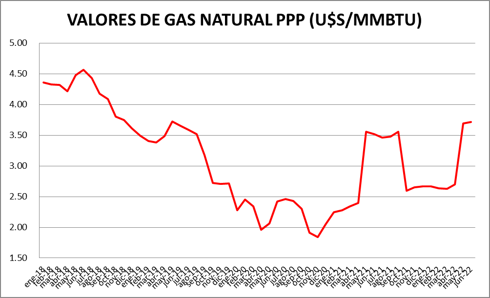 En mayo de 2022 el valor informado, de 2,63 u$s/MMBTU es un 30,2% mayor que el de abril. De esta forma, se remonta casi totalmente el descenso de mayo de 2021.
