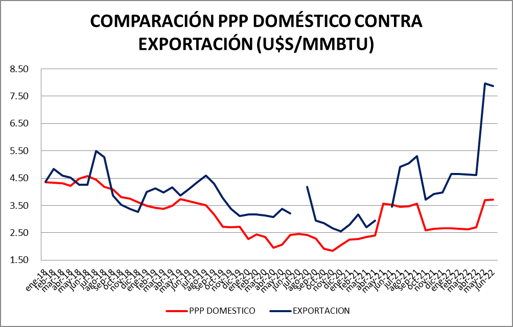 En cuanto al valor de las exportaciones, las mismas bajaron en junio un 1,3% respecto a mayo, al pasar de 7,97 u$s/MMBTU a 7,87 u$s/MMBTU.