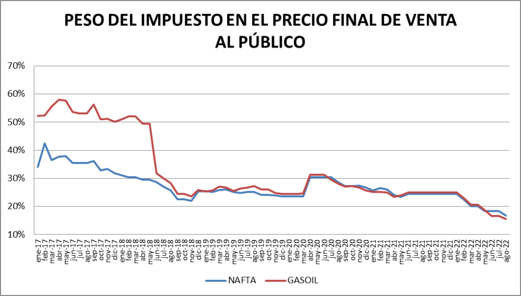 Y en el caso de la nafta pasa de 42,5% en febrero de 2017 a 16,8% en agosto de 2022.