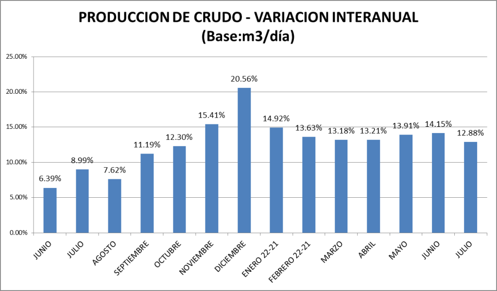 La producción de petróleo crudo del país en julio de 2022 subió un 0,71% respecto a junio del mismo año. Con respecto a julio de 2021 la producción es un 12,88% superior. La comparación con junio de 2019 muestra al 2022 un 14,32% por encima.