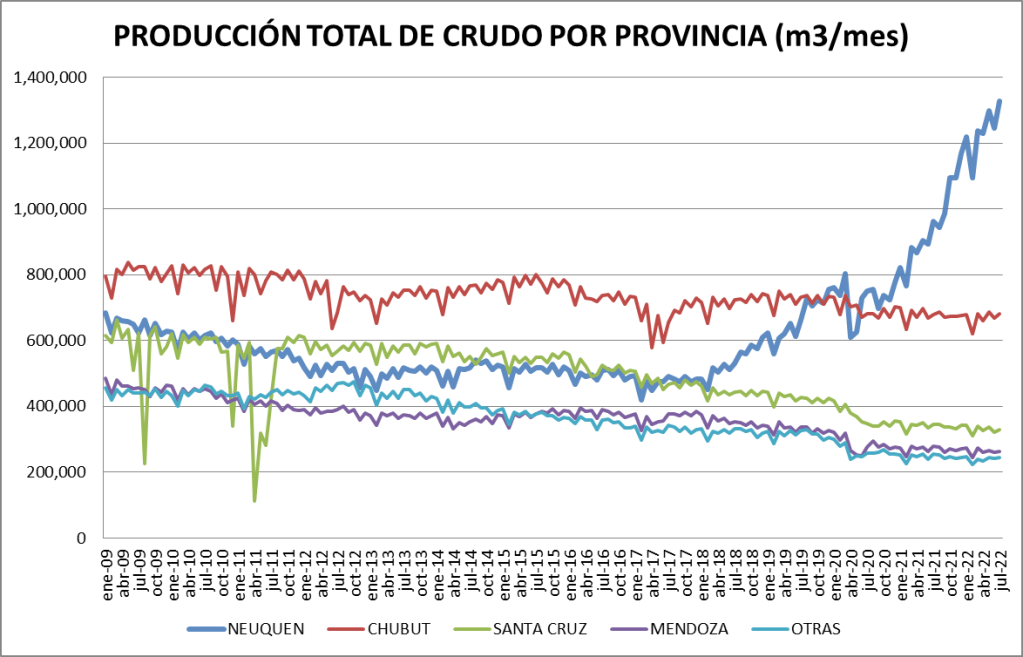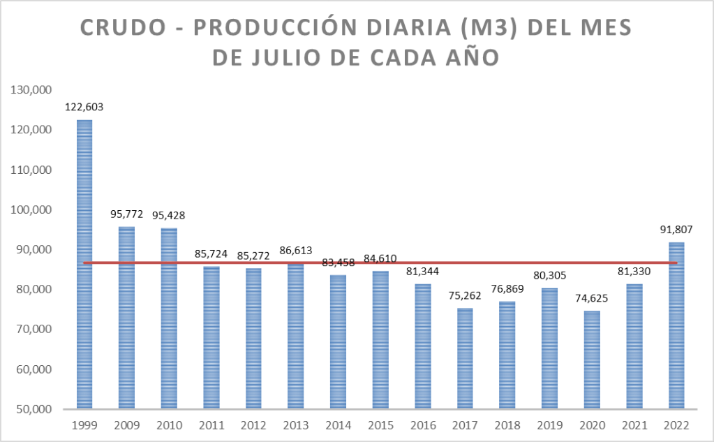 De los meses de julio de los últimos años, la producción de crudo del año 2022 se ubica en la tercera posición, detrás de 2009 y 2010. Pero, muy lejos todavía del valor de producción diaria de julio de 1999.