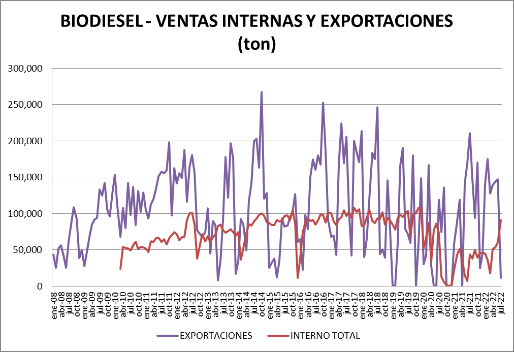 Para el biodiesel, la información parte desde enero de 2008 para las exportaciones y desde febrero de 2010 para la venta a refinerías.