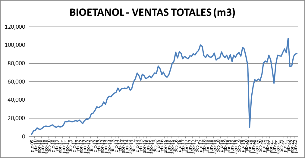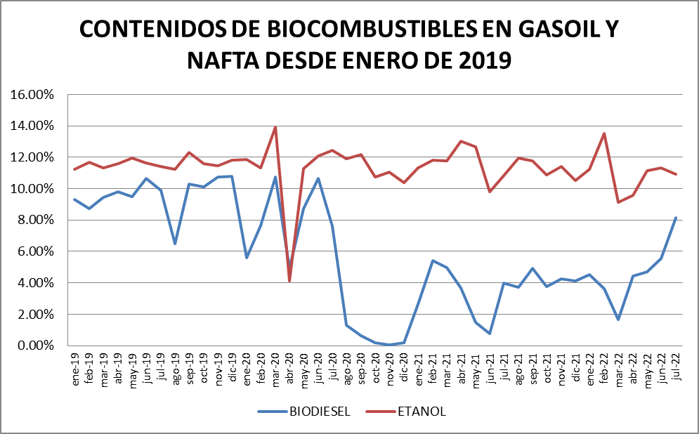No pasa lo mismo con el etanol (probablemente por el aporte de octanos al blend de naftas). El contenido de bioetanol en naftas fue del 10,9% en julio de 2022 (13,9% en marzo de 2020 fue el máximo).