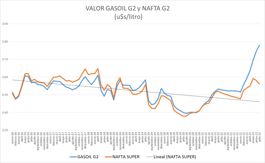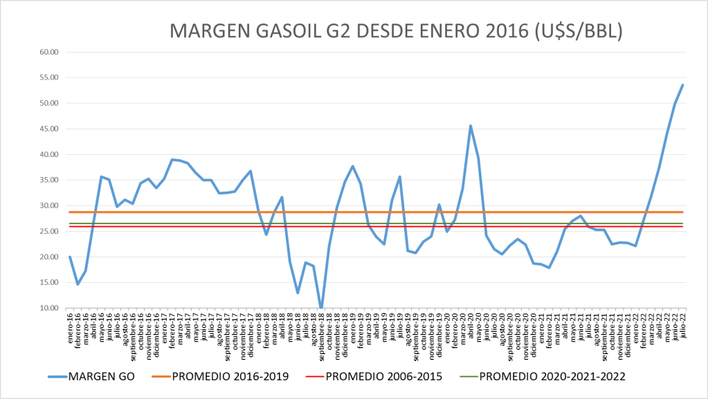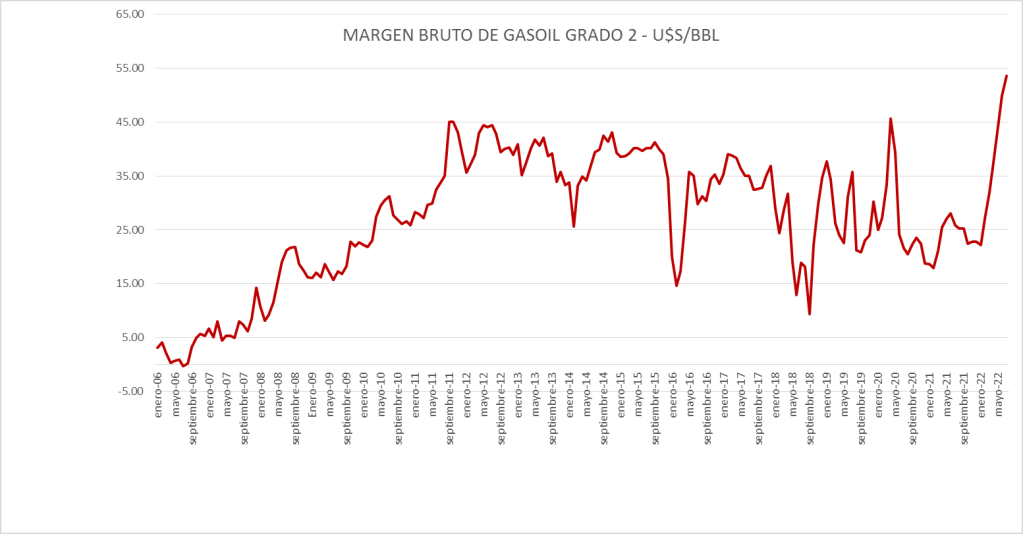 En julio de 2022, por sexto mes consecutivo, se produce un importante incremento del Margen Bruto de Refinación del gasoil grado 2 de un 7,33%, mientras que el de la nafta súper vuelve a bajar, esta vez un 21,7%, ambos respecto a junio del mismo año.