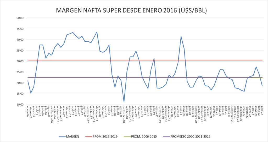 El margen bruto de nafta cae por debajo del valor del promedio del período enero 2020 – junio 2022.
