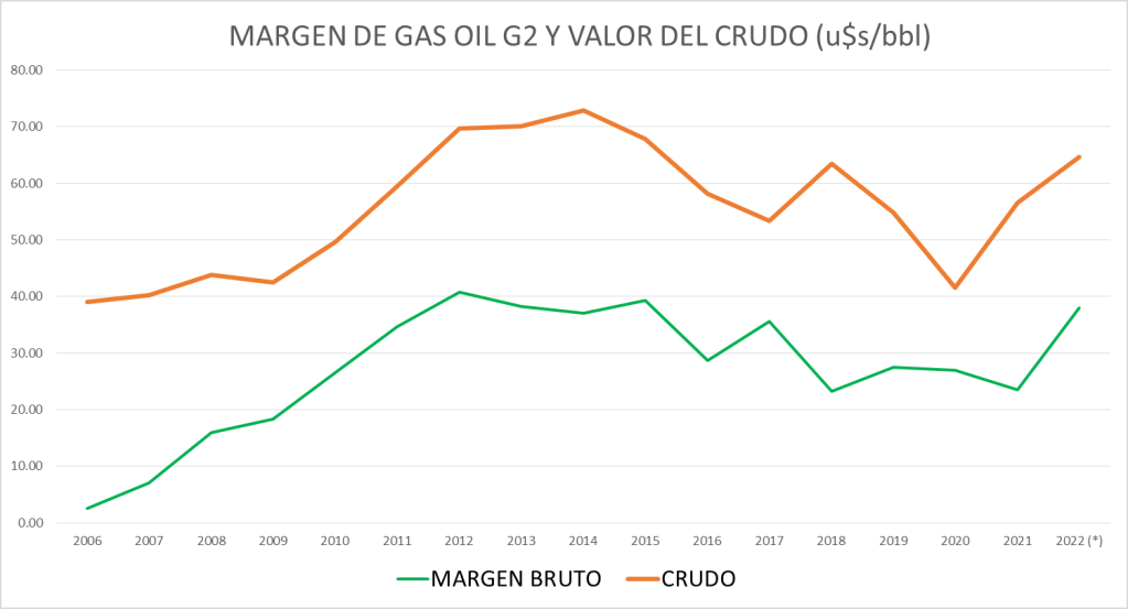 | Año | Valor (u$s/litro) | Margen (u$s/bbl) | Crudo promedio (u$s/bbl) |