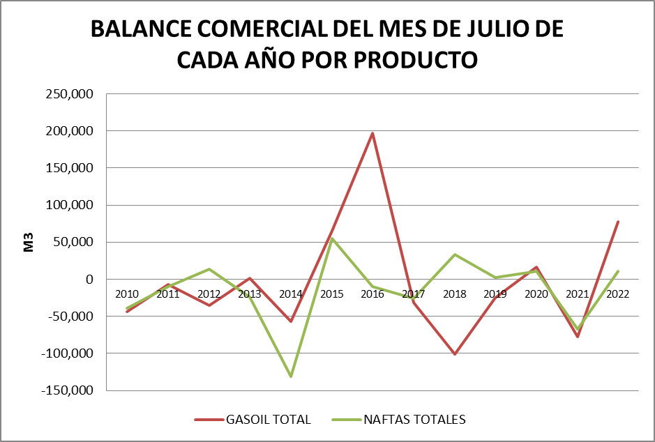 Vemos en el gráfico que en julio de 2022 el balance de la serie resulta positivo para la suma de los cuatro productos, llegando a 88.004 m3, con negativos en gasoil grado 2 (-138.272 m3) y en nafta grado 2 (-38.270 m3).