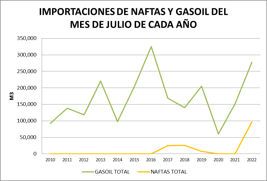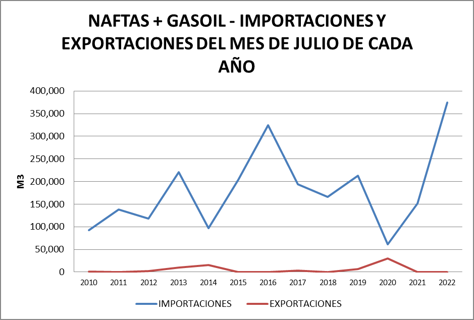 El volumen importado de naftas y gasoil en julio de 2022 resulta el mayor de la serie tal como había sucedido en febrero y marzo, donde se batieron records de importación. A esta conclusión se arriba después de verificar que la importación de nafta es la mayor del período, mientras que la de gasoil resulta la segunda más grande, como vemos en el gráfico de abajo: