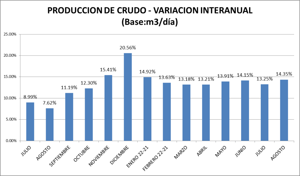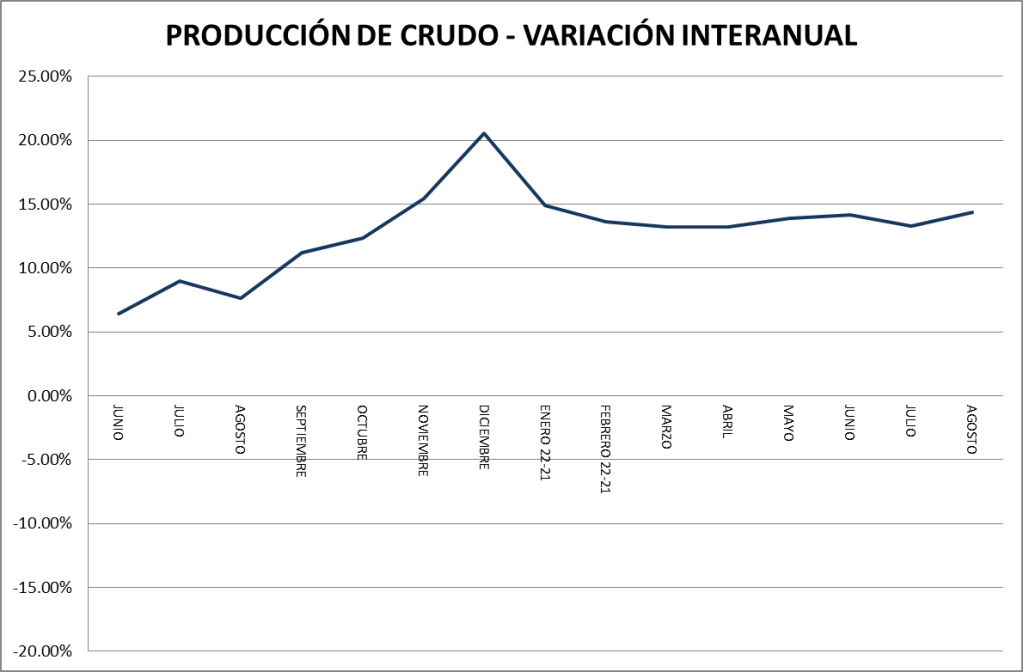 La producción de petróleo crudo del país en agosto de 2022 subió un 0,36% respecto a julio del mismo año. Con respecto a agosto de 2021 la producción es un 14,35% superior. La comparación con agosto de 2019 muestra al 2022 un 11,97% por encima.